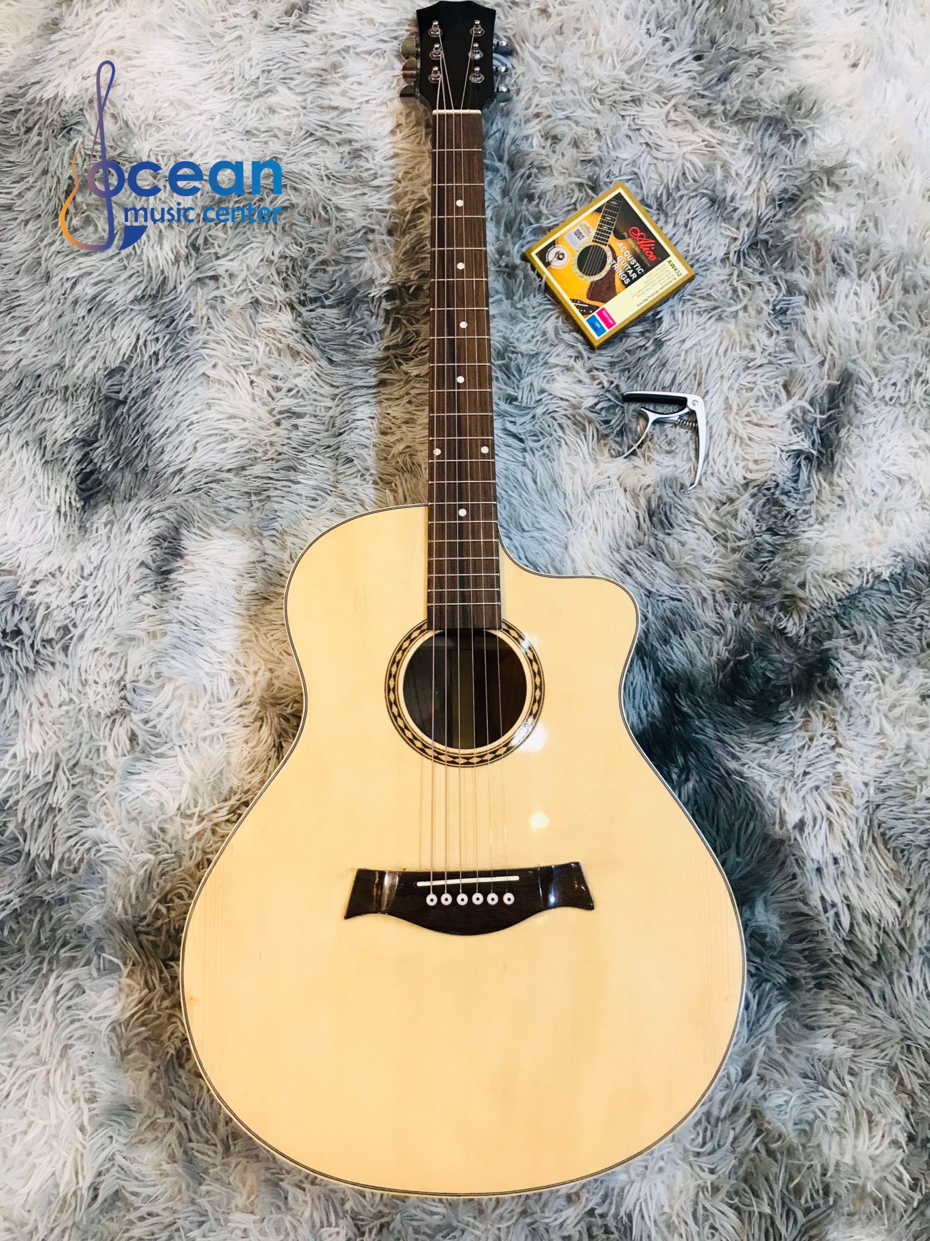 – Phụ kiện tặng kèm khi mua đàn: Bao da 3 lớp, Capo guitar, 01 bộ dây đàn dự phòng kèm theo, miếng dán chống xước, pick gãy đàn, tài liệu học Guitar.